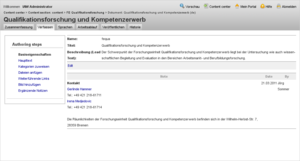 Under the name ScientificCMS a team of the university of Bremen, supported by the Collaborative Research Centre 597 “Transformations of the State” and of the Institute for Work and Economy (IAW = Institut für Arbeit und Wirtschaft), develops a content management-platform. It especially takes into account the special needs of scientific research institutions. The approach of ScientificCMS is best to describe with “manage your content NOT your pages”. In this process, the information is not managed as websites, but saved in a structure according to content type, the “Content Items”. The preparation and development of this information is carried out by category systems. The websites are then rule-based from the „content items“ and the category system, as well as program-controlled and arranged by ScientificCMS. For the individual requirements of scientific research institutions there are programs, which arrange to a “ready to use”-system and can be installed.